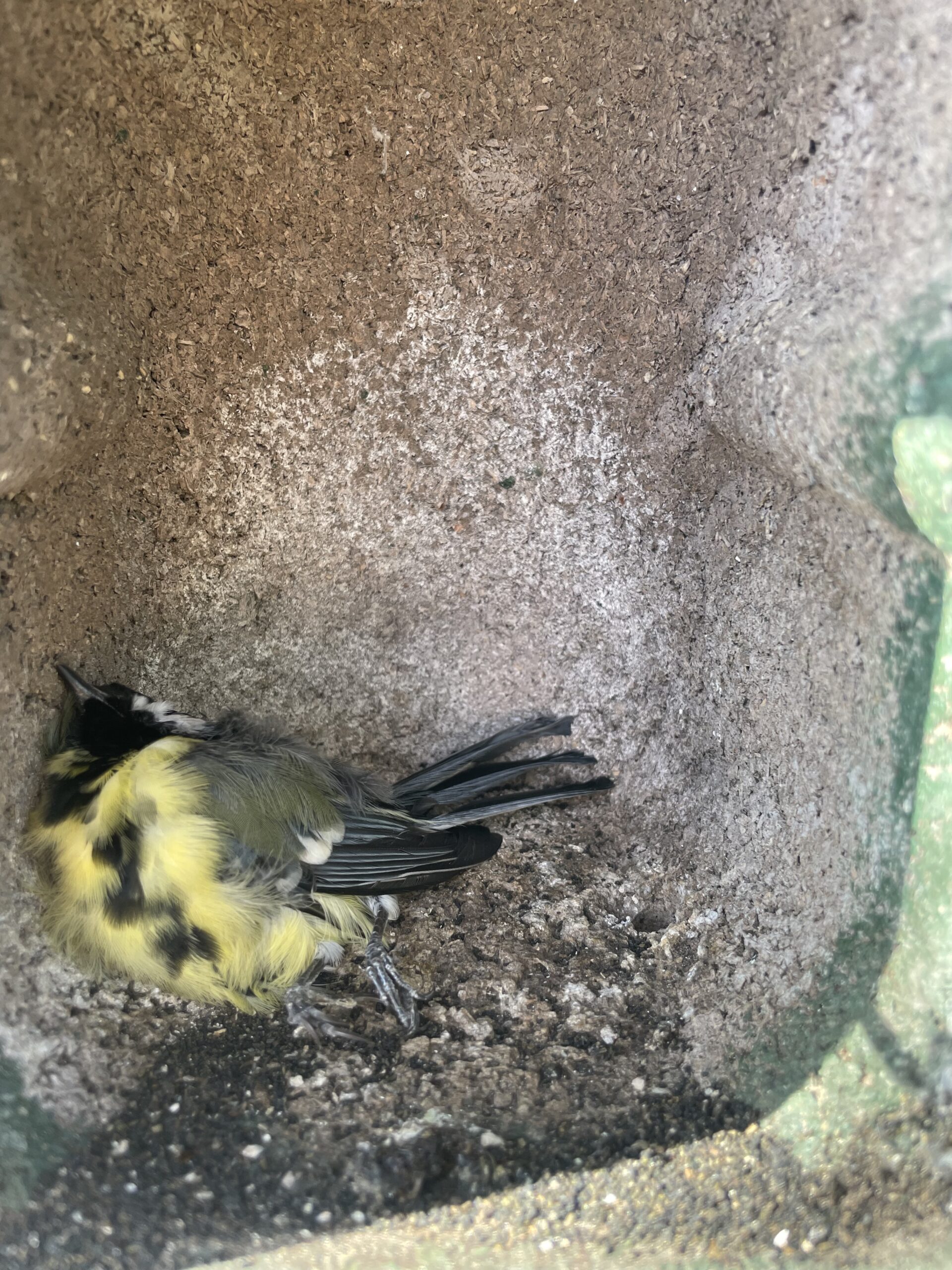 In één van de nestkasjes lag een dode Koolmees. Naar ik aanneem in de slaap gestorven. Ookal zie ik ook nog wel de mogelijkheikd dat een kat uit de buurt dit op z’n geweten heeft. Eerder in de winter meegemaakt dat een kat de slaapplaats van een mees wist te vinden die in een holletje in de slaapkamermuur sliep. Door de onstande consternatie werd ik wakker en verjoeg ik de kat, maar de mees was was het al teveel geworden en lag door in het holletje… 😢.